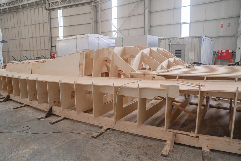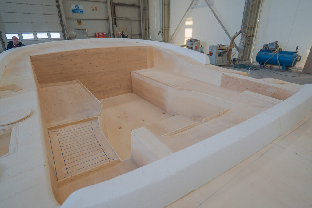 The carpentry team use wooden planking to sculpt the shape of the deck and cockpit for the plug while the hull undergoes lamination with a layer of bi-axial fibreglass cloth. Once dry, the hull is then covered with filler and faired. The sanding process is the most time consuming part but a perfectly smooth finish is required before painting. Once complete, the hull is painted, varnished and made ready to form the female hull mould.