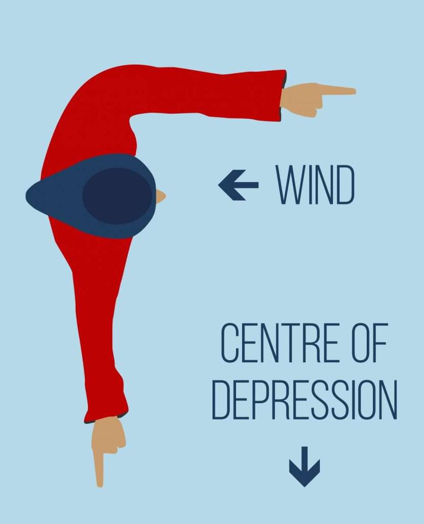 Our satellite communications are still down, we’ve watched the clouds, looked at the wave patterns, checked the barometer and the hygrometer and we know there’s a storm coming, but where, in relation to our position and our intended course, is it? Face directly into the wind, not the apparent wind, and if you’re in the northern hemisphere hold your right arm out from your side (left arm if you’re in the southern hemisphere) and your right hand is pointing to the centre of the depression, give or take 10 degrees. As shown below.