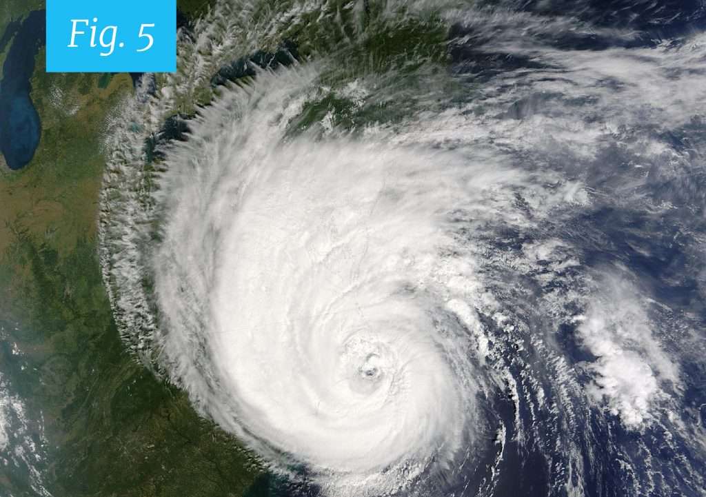 What you won’t know, without seeing a weather chart, is how deep that depression is. They range from around 1,000 millibars for an average minor depression, to a category 5 cyclone (hurricanes or typhoons are the same thing) with a pressure of less than 920 millibars. Hurricane Wilma was the lowest ever recorded, at 882 millibars. The deeper the depression the greater the wind (See Fig. 5).