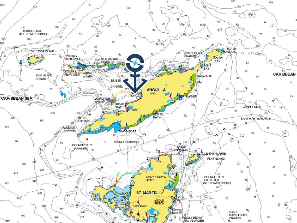 A lovely escape from the madness of St. Barts or Saint Martin is to be found some 23NM and 7NM to the south in Crocus Bay, Anguilla. It is an excellent anchorage with nice restaurants and bars a short dinghy ride away on the beachfront. The restaurant Da’Vida is especially good boasting great food, drink, views and friendly staff.