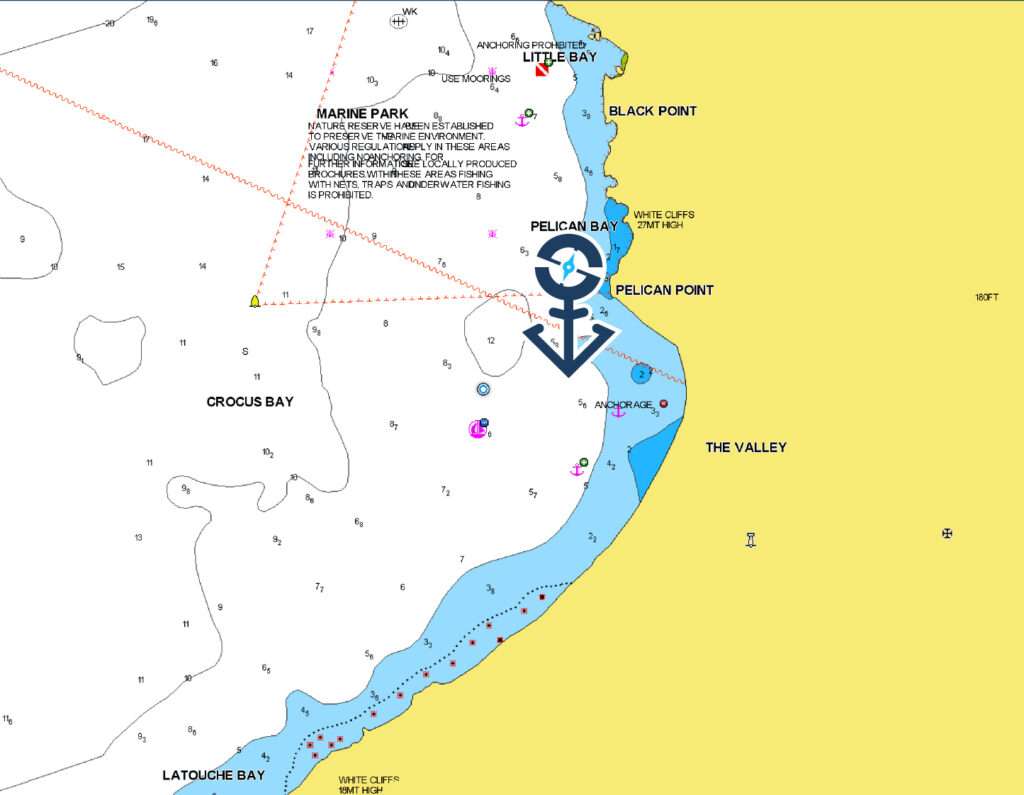 Seabed: Sand, good holding. Anchor in six to ten metres of water