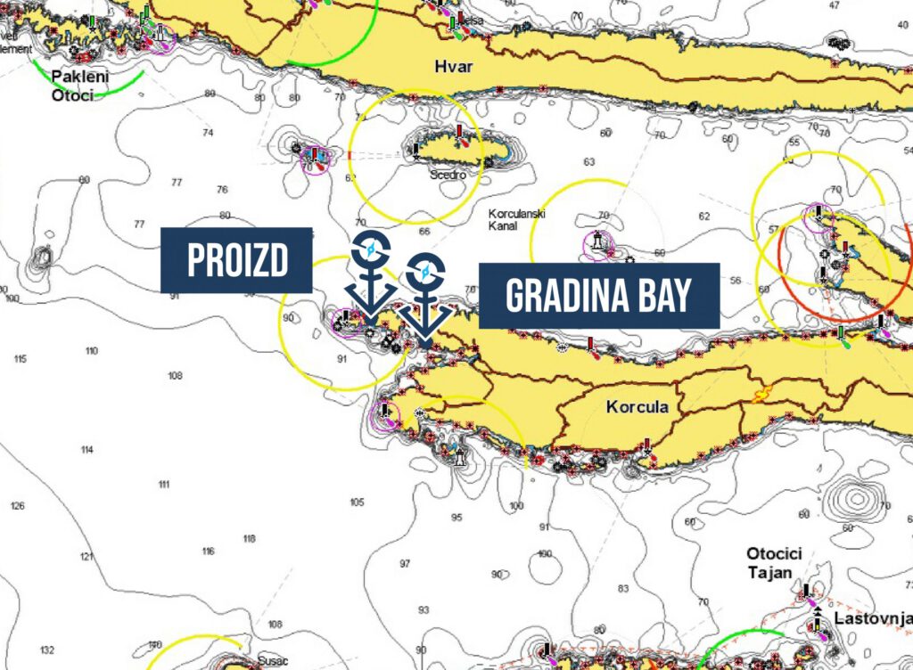Coordinates: Gradina Bay 42°58.34’N 16°40.45’E / Proizd 42°59.04’N 16°37.54’E