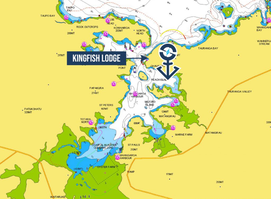 Near the entrance of the sound, there’s a good restaurant at the Kingfish Lodge (Tel: 09405 0164), but you will need to prebook a day in advance. There is a pier where you can moor your dingy.