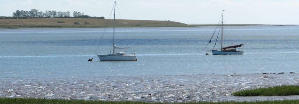 The ferry itself – a large skiff rowed by the ferryman – stopped carrying farm workers across the Swale in 1941, ending almost 300 years of service. The stony hard on the south side still leads up between tall witheys to the sea wall where there is a fresh water spring to fill your beakers. On the north side a broken causeway sports the wooden winding gear once used by the ferryman.