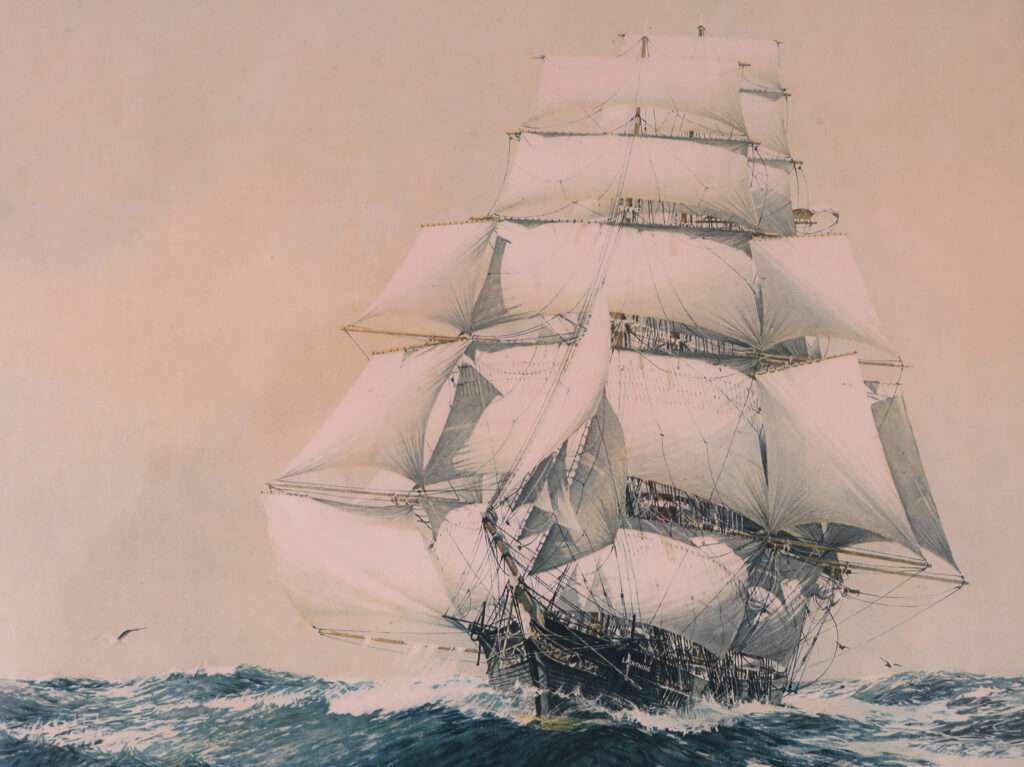 Pronounced by the old shellbacks who set them as stuns’ls – carried on the square-riggers of yesteryear as extra canvas in favourable downwind conditions to get the freights of tea back to the auction houses of Europe in hoped for record passages. They evolved, on naval ships, as great jibs known as fly-by-nights: the head set from the topmast and the clew and tack set from the upper yardarm.