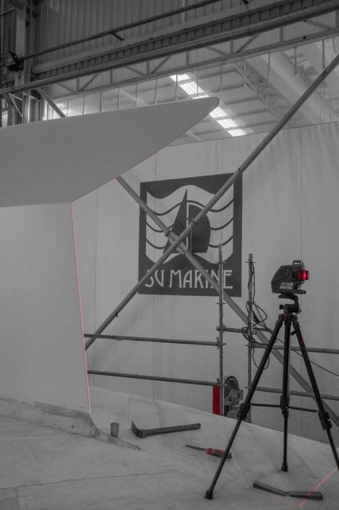 At the same time as the hull section is built, the rudder skeg and ZERO Keel are CNC cut from construction foam. These are then covered with filler, faired and laminated before they are ready to be inserted into the hull. Once craned to the hull and carefully inserted in the slots, computer analysis ensures these are located correctly. Each element of the plug must be precise to make certain every boat is perfect. Laser measurement tools are used at multiple points to check alignment and measurements reflect the computerised model and drawings.