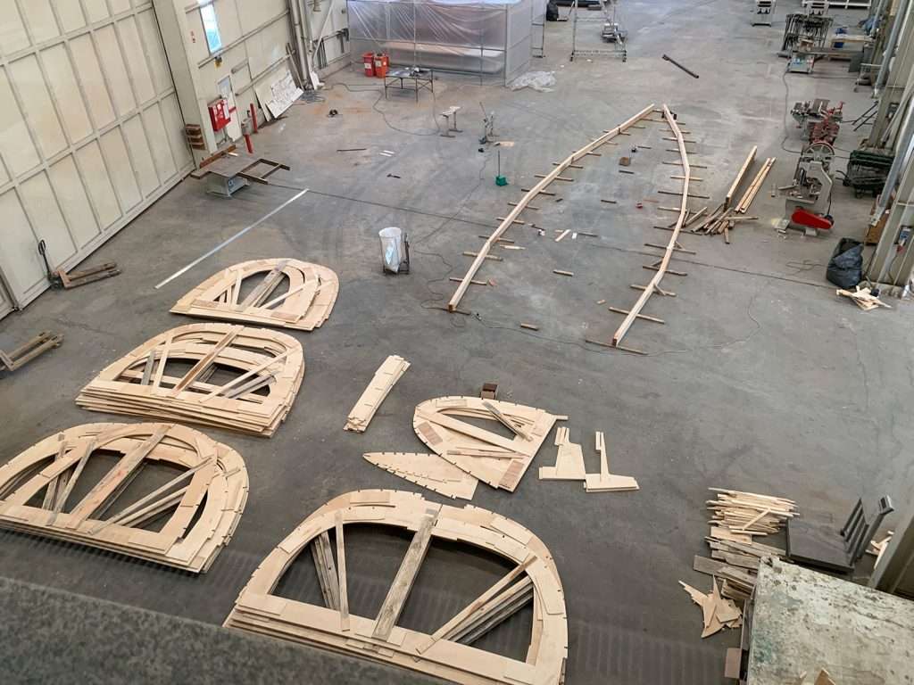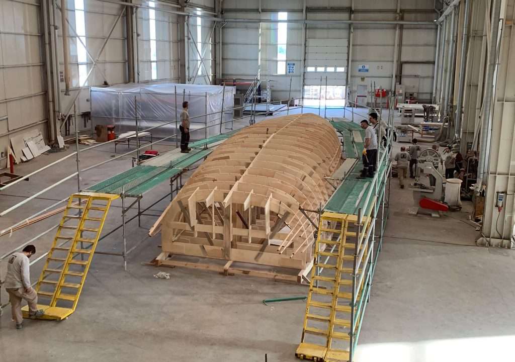 The hull frames are laid out in order and connected together, much like a giant jigsaw puzzle. At this point, we have an upside down skeleton of the yacht and the basic structure is ready to be covered. The expert carpentry team takes wooden planks to create the shape of the hull, eventually finishing with three layers. Once this has been completed it is ready to be faired off.