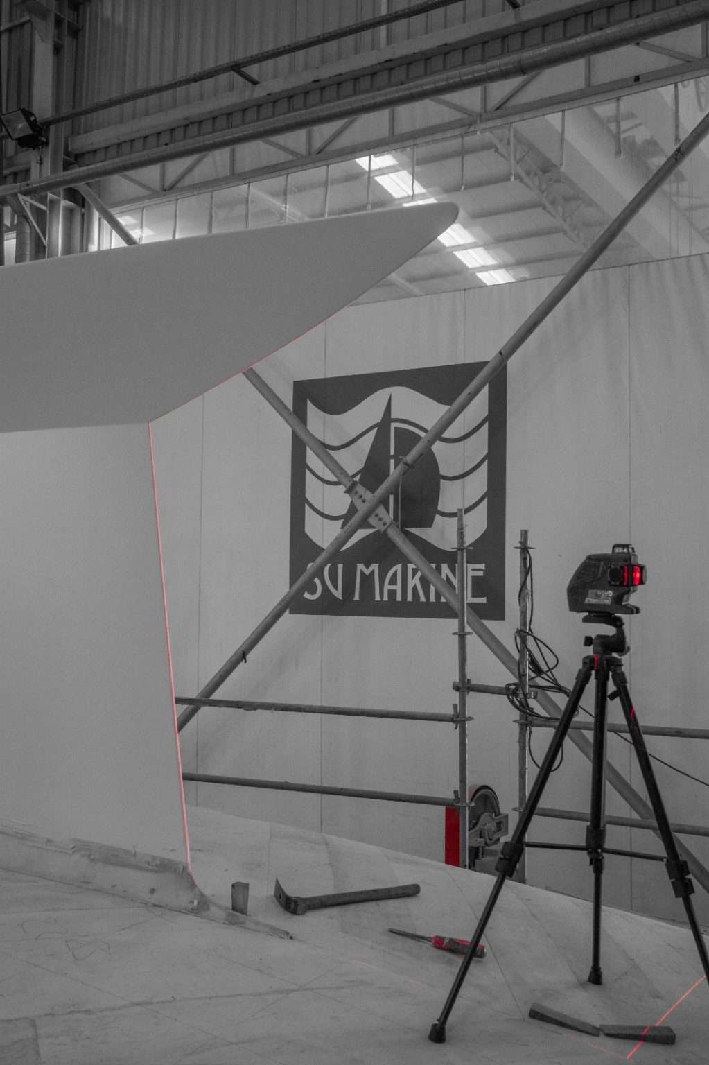 Laser measuring tool checking the alignment of the keel after being inserted into the hull structure