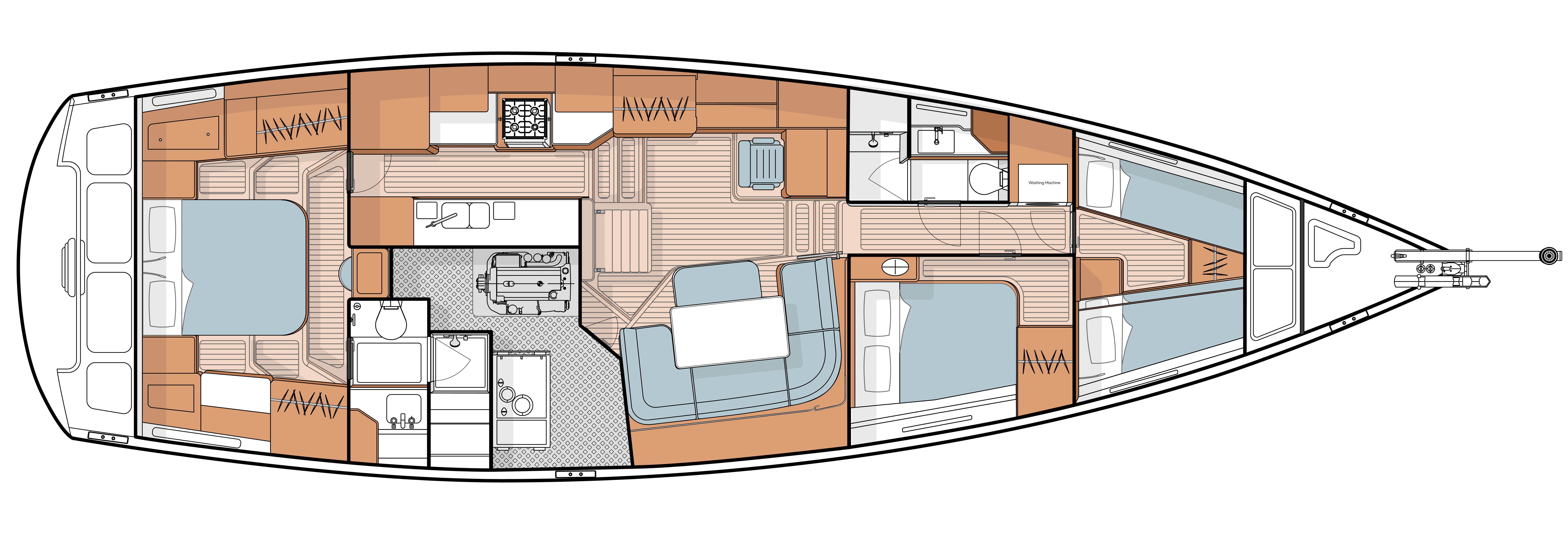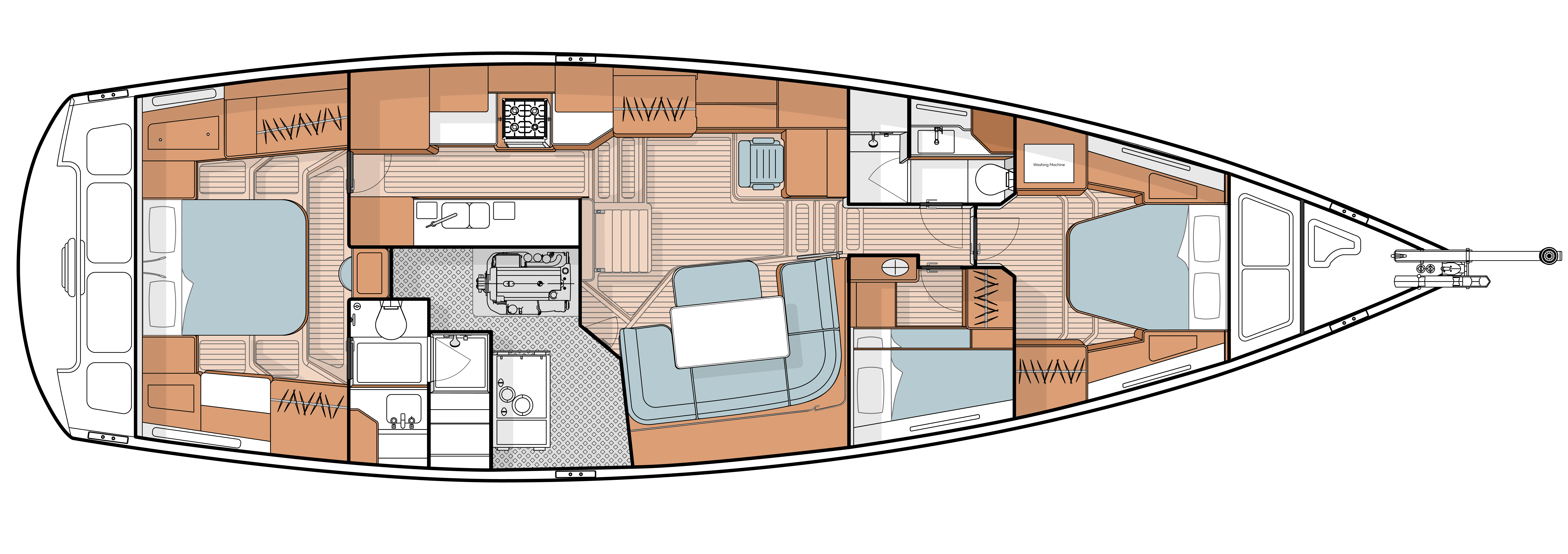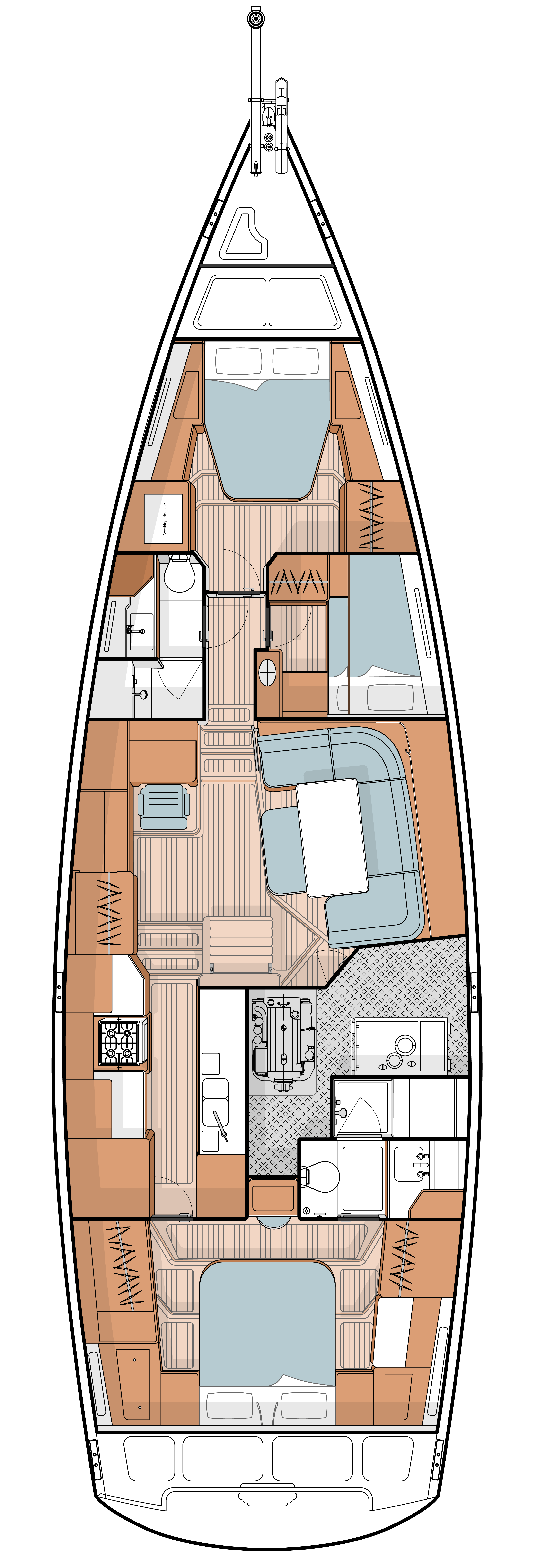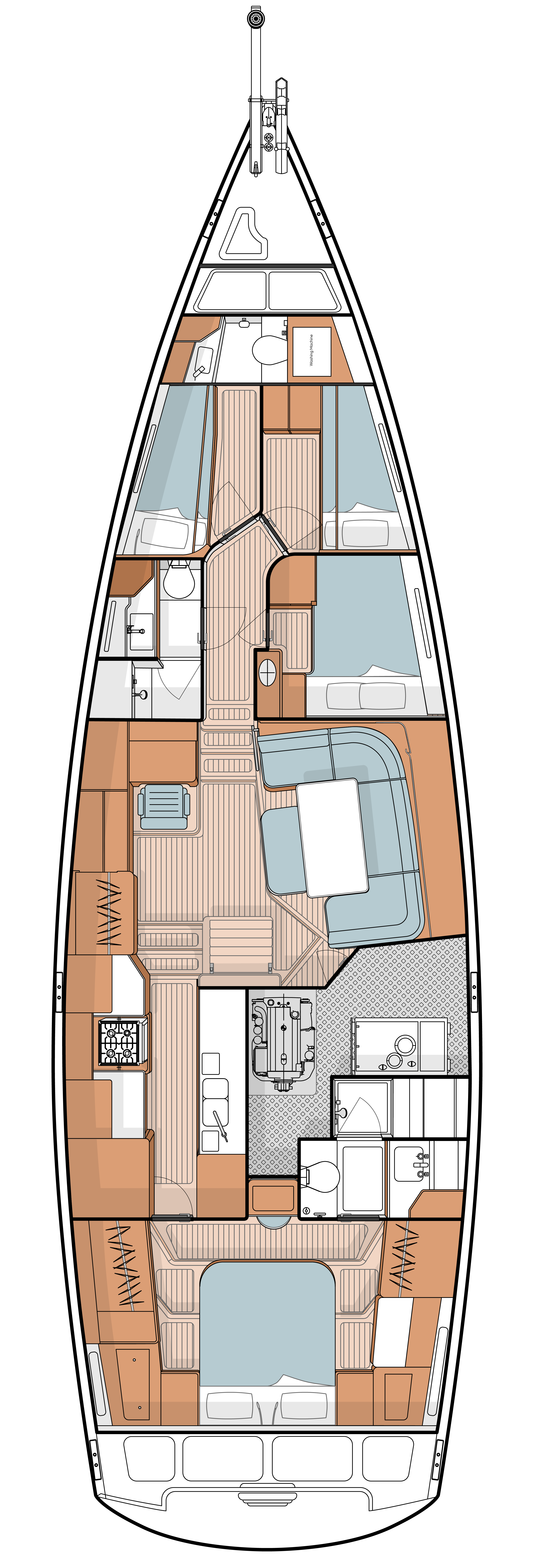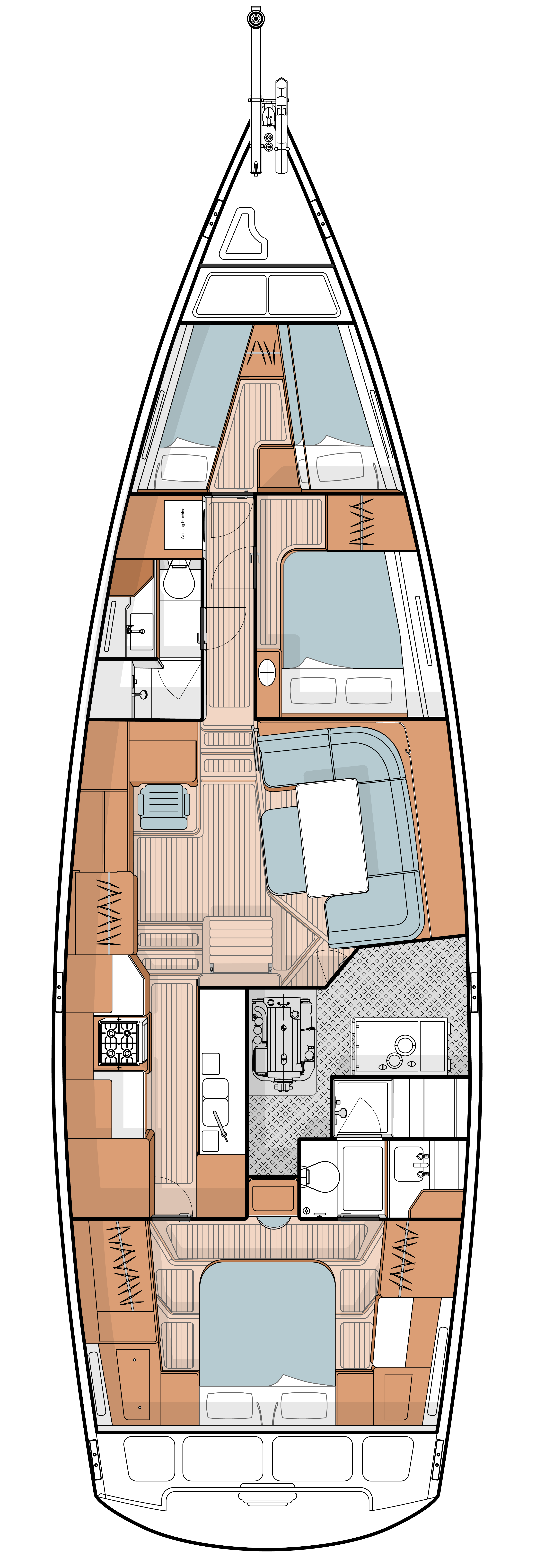 Dual headsail Solent rig for easy handling and performance at all points of sail. The ultimate long-distance cruising rig.