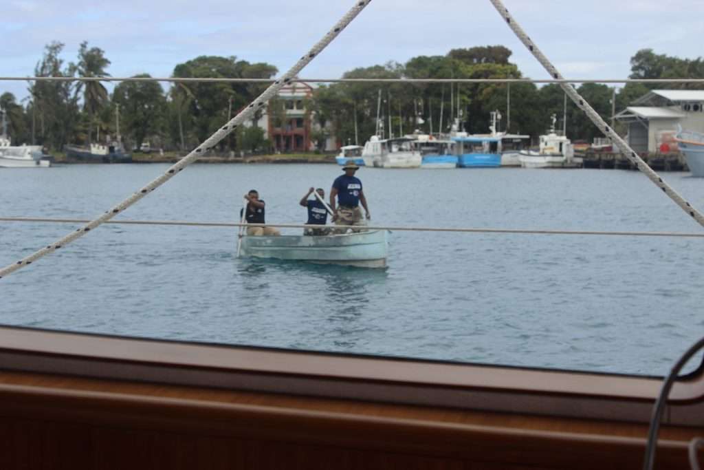The police station was of course shut for a 2 hour lunch, but after eventually registering with the police station, I then set off to the ‘port’, to meet the customs, immigration and coastguard who insisted on a visit aboard the next morning. See the photo below of Customs, Immigration and Port officials arriving in their launch!