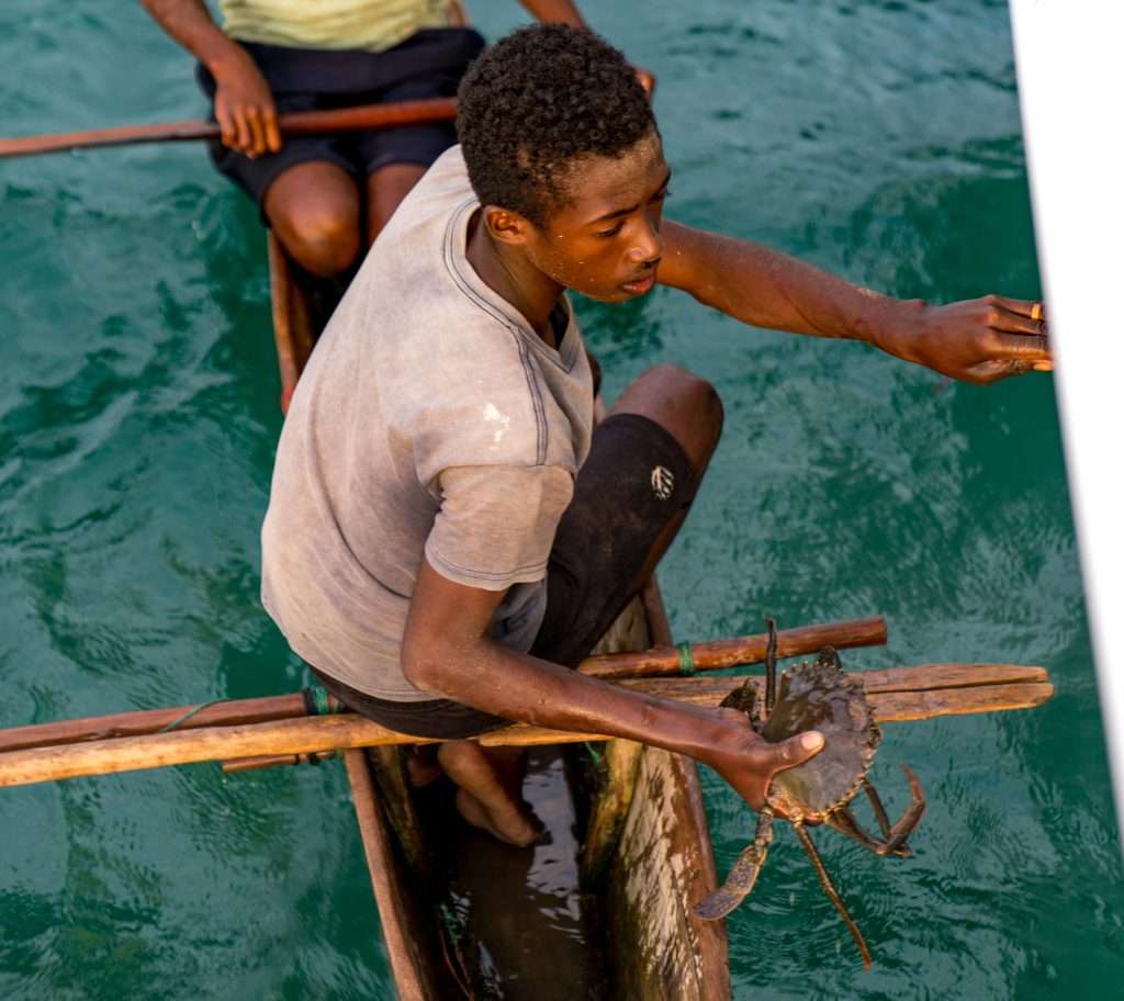 As the wind died down and the sun sank lazily towards the horizon, we rounded a headland and sailed up the Honey River channel to find a safe spot to stop overnight. After boxing the anchor several times we eventually found a perfect anchorage and dropped the hook in front of a small village, a hive of activity with children playing and the locals mooring dhows on the beach. Not long after the anchor was set, a couple of teenage boys approached in a small dugout. Dick smiled knowingly and winked at us before walking to the transom to talk with them. Intrigued, I peered down and saw one of the boys reaching carefully into a sack, retrieving a large crab and holding it up for Dick to inspect.