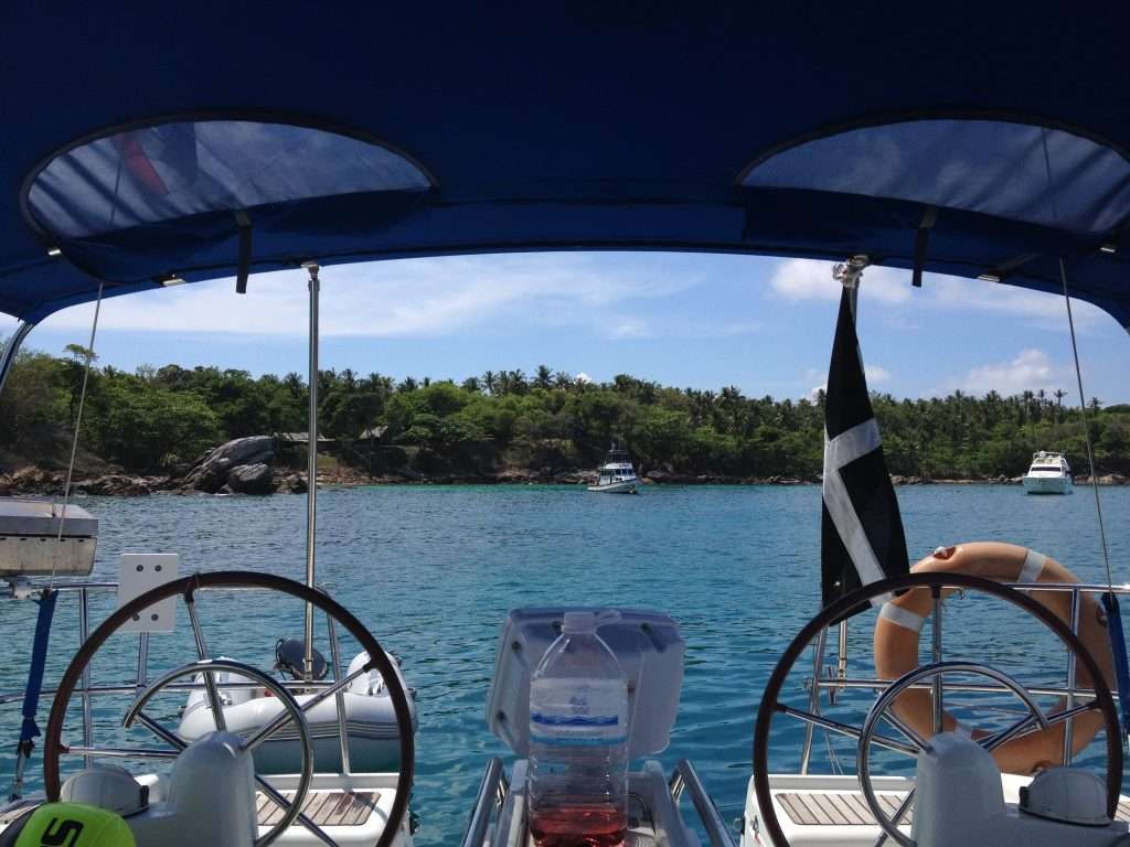 Staring out at the beautiful bay the next morning, I started to raise the anchor when suddenly the windlass struggled and I quickly released the button. After a few minutes of lowering, moving the boat and raising, we turned off the engine and donned some snorkelling gear to check what the anchor was snagged on. By sheer bad luck, during the night the chain had wrapped around the only rock bommie on the seabed. To make matters worse, the anchor was sitting in about 15m of water and we simply could not clear it without diving gear. So being Englishmen, the obvious plan was to make a cup of tea and consider our predicament. Whilst sitting in the cockpit discussing the situation, I spotted a boat in the distance. A quick scan of the binoculars confirmed our suspicions, it was a dive boat. Mawgan raced off in the dinghy and returned a few minutes later with a divemaster and two sets of gear. They donned the equipment and spent the next 30 minutes clearing the chain.