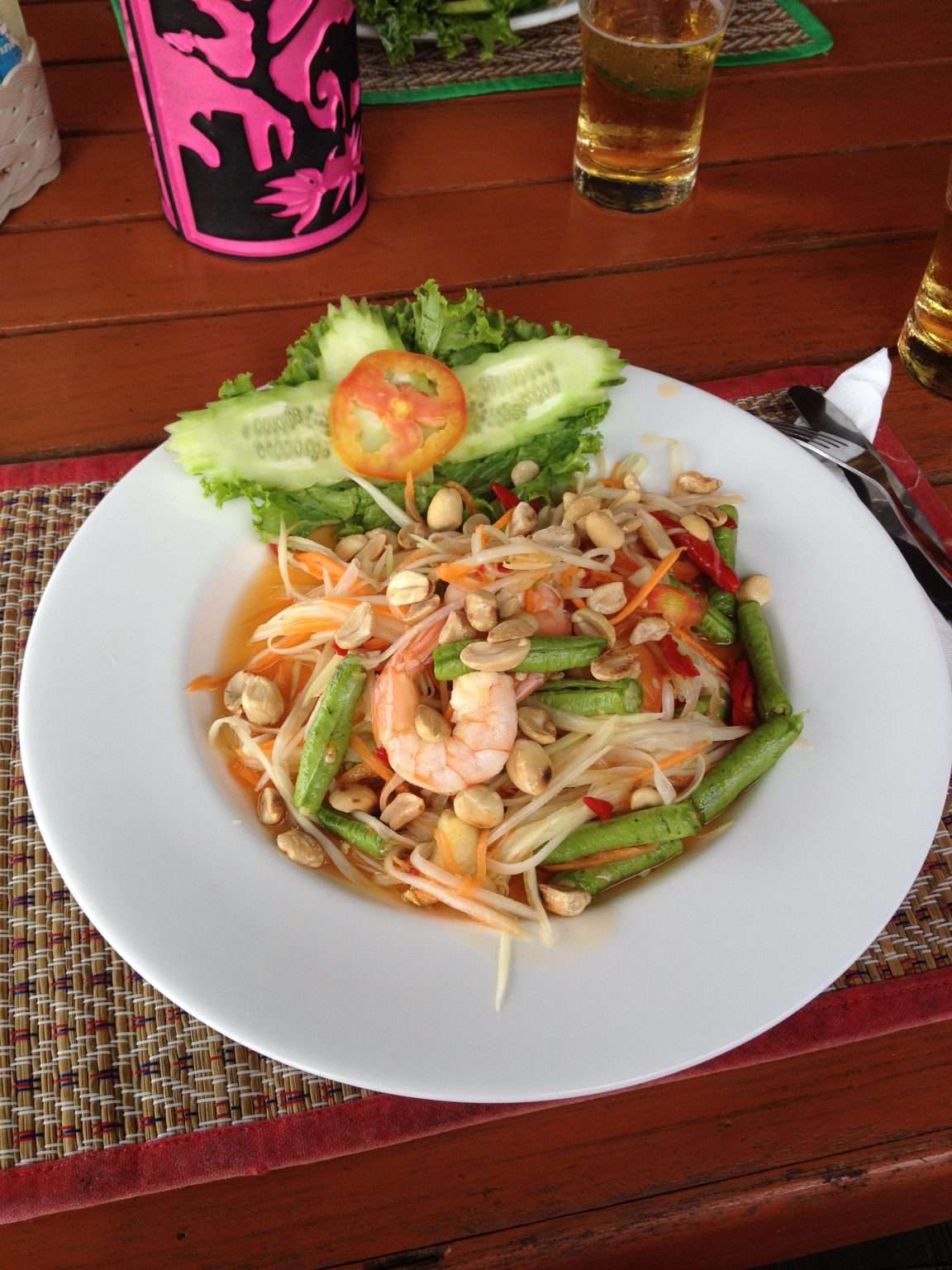 Having dried off in the cockpit with the obligatory sundowner, we launched the dinghy and made the short run ashore for dinner. Even being a very small island, Koh Racha Yai still offers a plethora of restaurants from 5-star dining at the big resort, The Racha, or cheap local Thai cuisine from one of the bungalows on the island. In our experience, the food from the local places often trumps the 5-star dining, so we pulled up a plastic chair and within minutes were chowing down some Som Tum (Green Papaya Salad), Pad Thai noodles and curry.