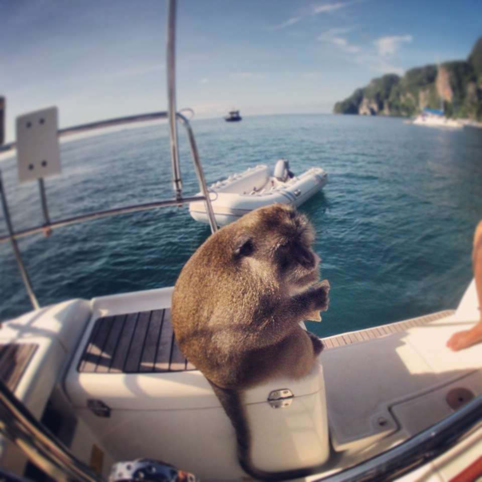 On our final day, whilst Matt was finishing his course, Mawgan and I stayed aboard and planned the route back to Phuket. Hearing a rustling in the galley, I turned away from the nav table and stared in disbelief at a small furry object examining our fresh fruit. ‘MONKEY!’ I shouted, at which my brother spun around and stared in equal amazement. My exclamation did nothing to faze our furry friend as he started peeling an orange and eating individual segments. We moved towards him, but instead of heading out of the companionway he ran into my cabin and sat down on my pillow, all the while shovelling orange segments into his mouth. Trying to carefully pull him out with a broom was unsuccessful, but we eventually coaxed him out and into the cockpit with more fruit. He left a soggy pillow behind and a trail of orange peel. We were amazed that he had swum all the way out to our boat to scavenge but this must have been a daily adventure for him. After a couple of oranges and apples, he jumped off the transom and swam off…unfortunately towards the busy ferry channel. We decided to go after him with the dinghy and take him to shore as he looked quite tired. As soon as we came alongside he climbed up and sat on our bow, water dripping off his fur. With the shore in sight he must have decided he was still hungry and proceeded to jump off the tender and scramble up the anchor chain of a large catamaran. About 10 seconds later we heard screams and pots clattering to the floor from within the cat’s saloon and the monkey sped out on deck clutching an apple and he cannonballed back into the water next to us. He then climbed back aboard and we dropped him at an overhanging tree onshore.