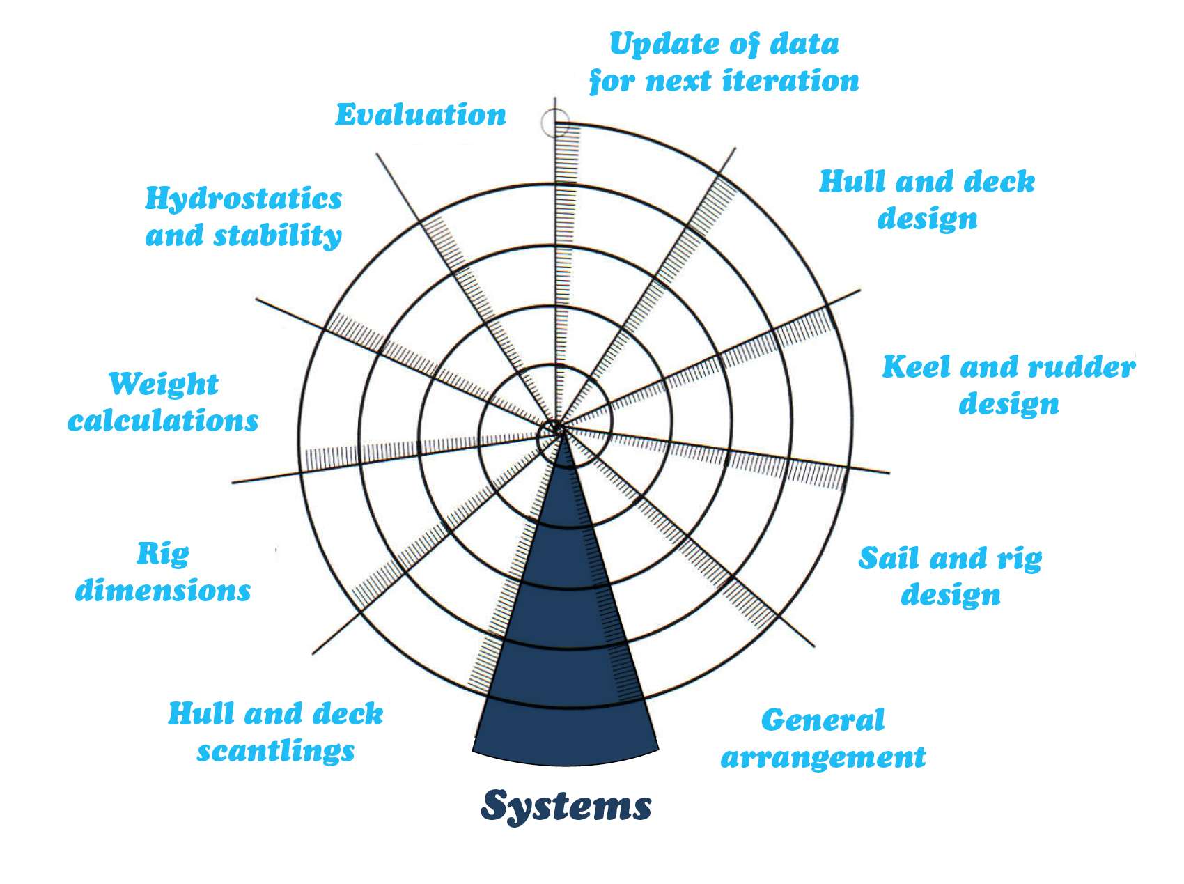 Referring to the design spiral, we are coming off the general arrangement and onto the systems. The main systems, such as drive system, i.e. prop shaft, propeller, engine and gearbox and the steering system will generally remain constant, but other systems may vary according to the options the owner has chosen.
