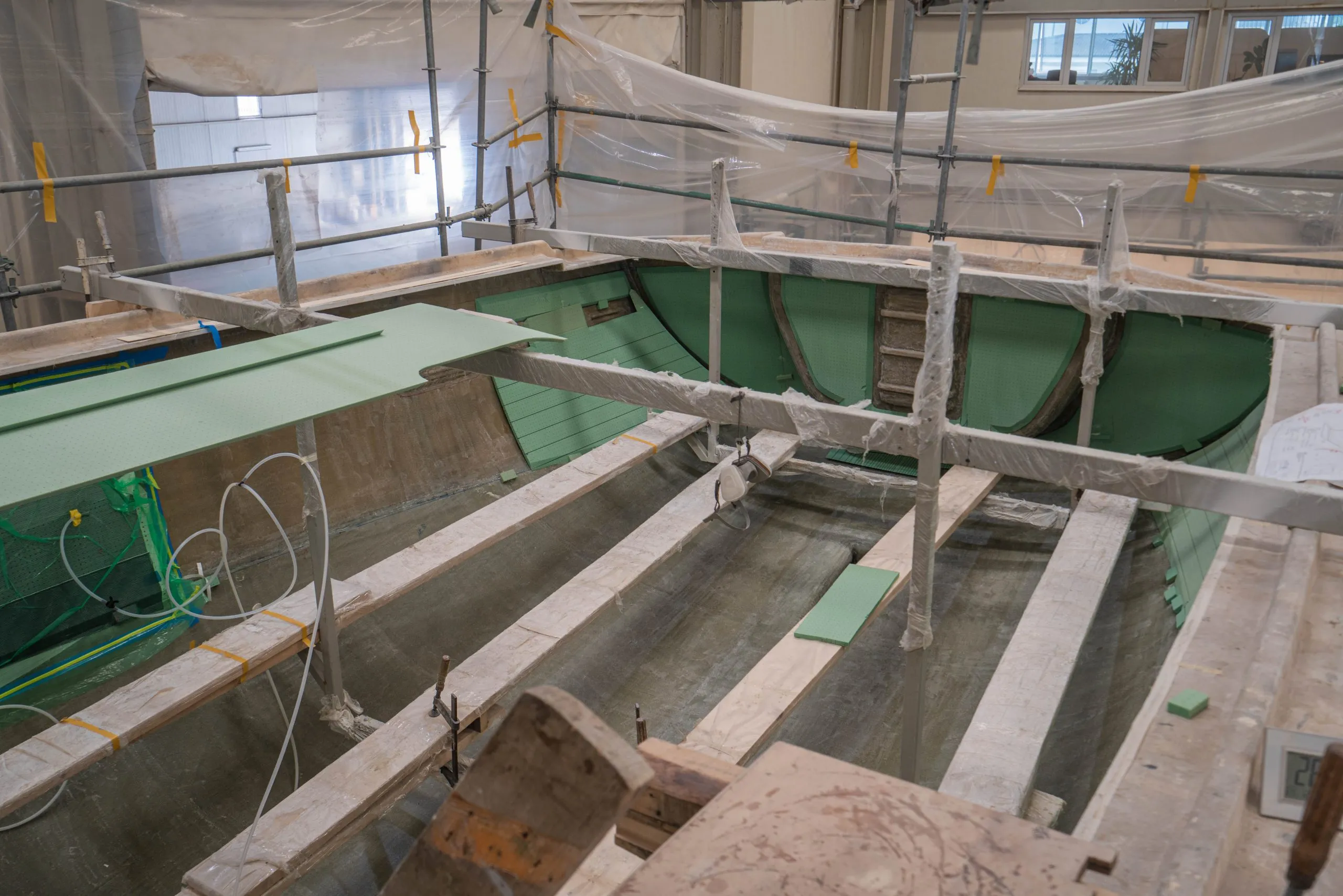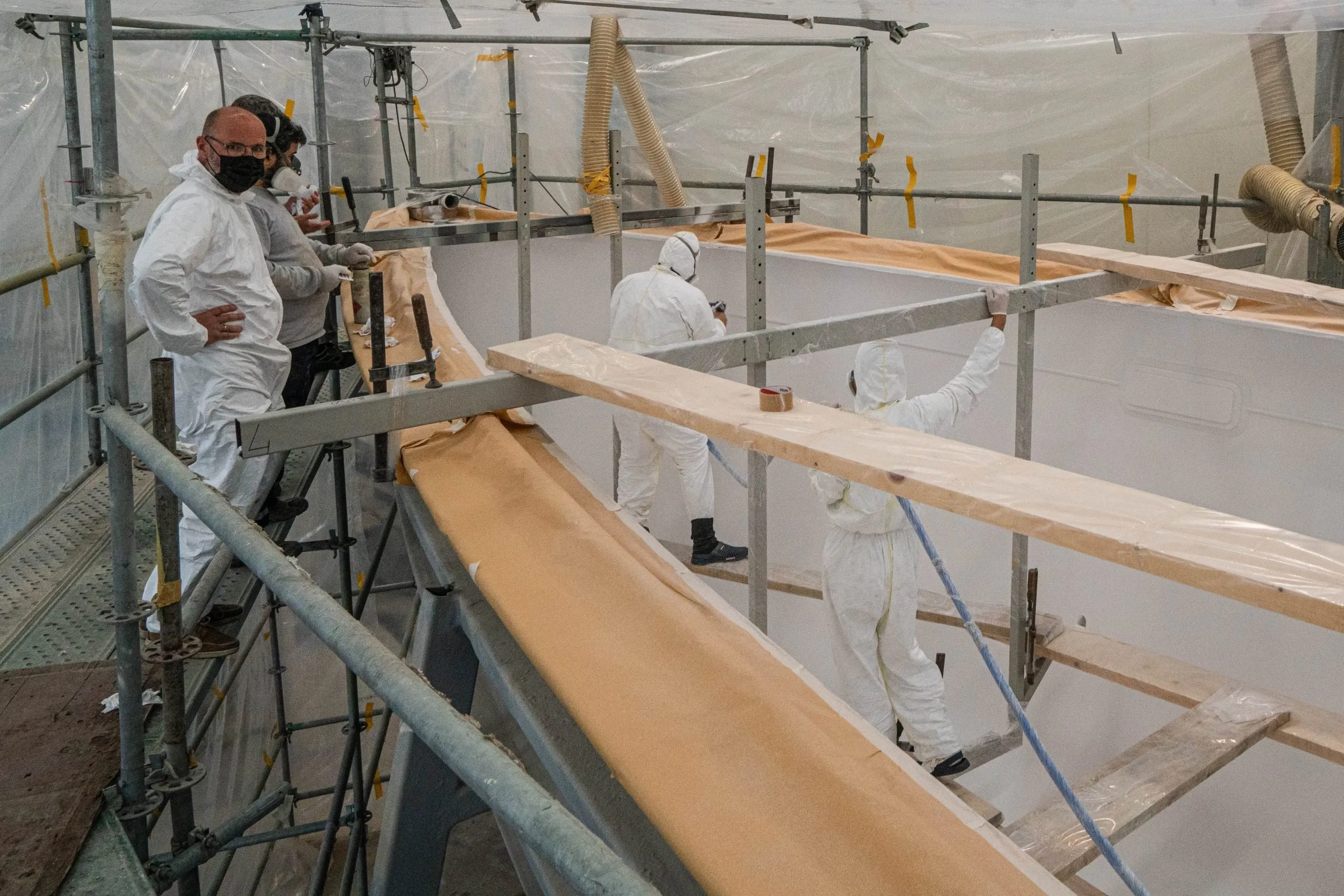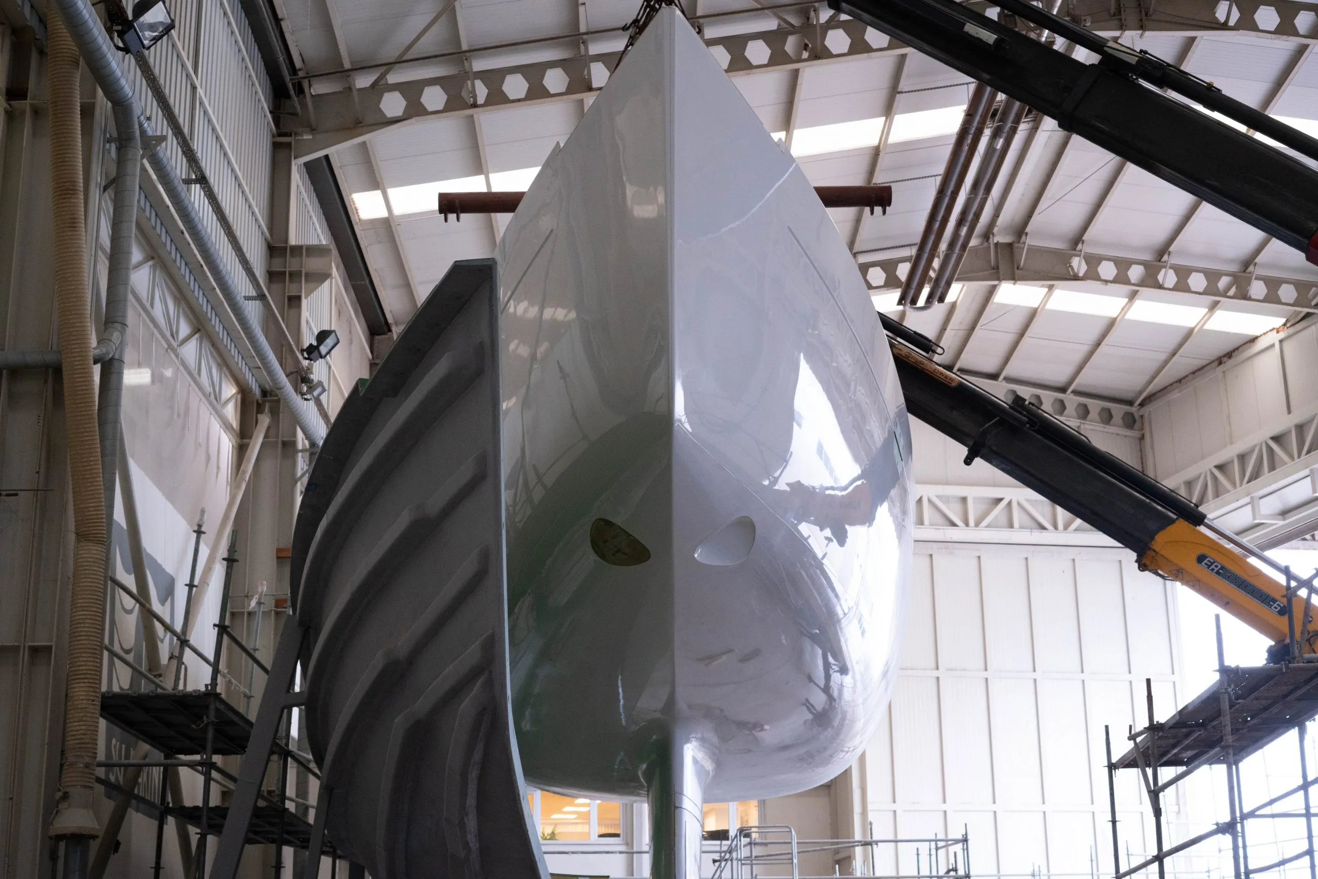 The ZERO Keel™ receives its massive 6.4-tonne lead ballast. The keel mould is actually split in two at this stage, allowing us to laminate the space within the keel prior to the lead being inserted. Both sides of the keel mould are connected and the lead is laminated into place from the keel sump. This allows us to build the only fully integral keel in the world with no bolts, including an integrated ballast bulb.