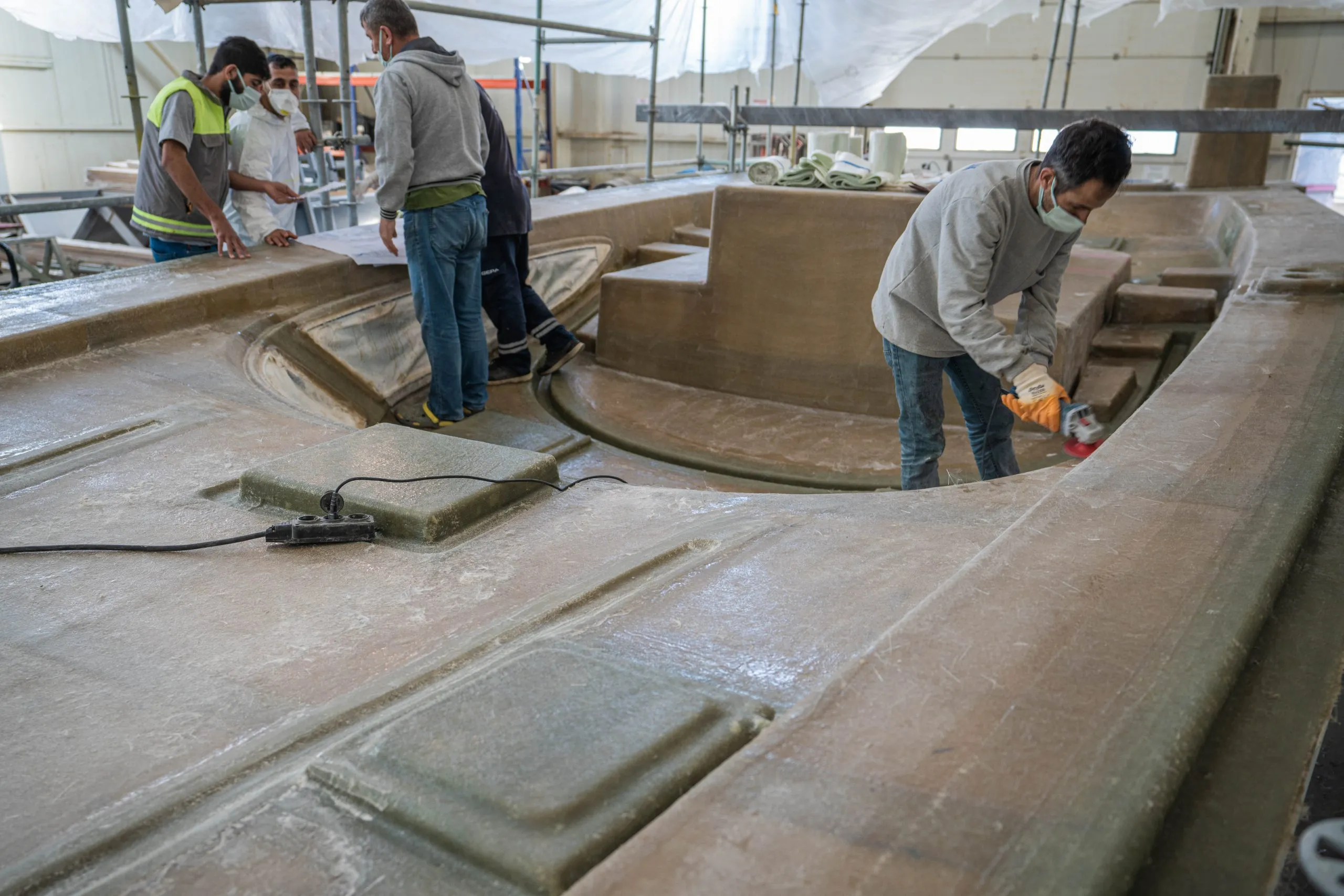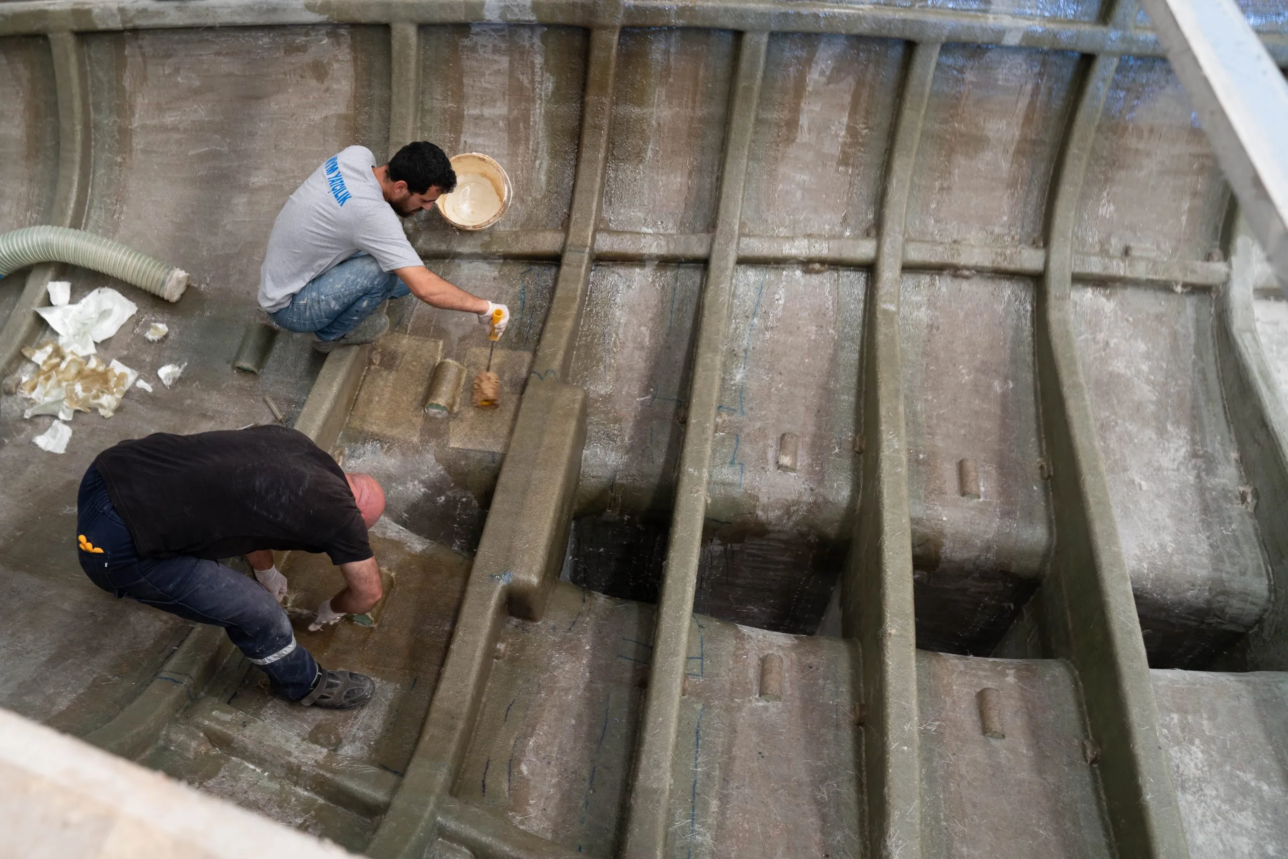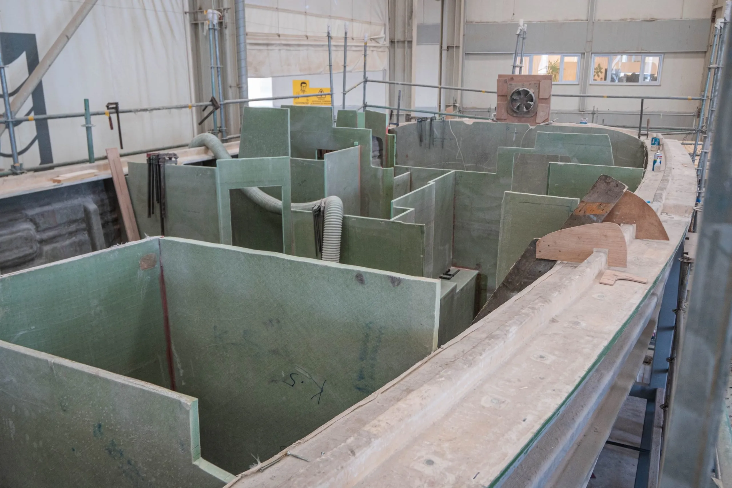 The ZERO Keel™ receives its massive 6.4-tonne lead ballast. The keel mould is actually split in two at this stage, allowing us to laminate the space within the keel prior to the lead being inserted. Both sides of the keel mould are connected and the lead is laminated into place from the keel sump. This allows us to build the only fully integral keel in the world with no bolts, including an integrated ballast bulb.