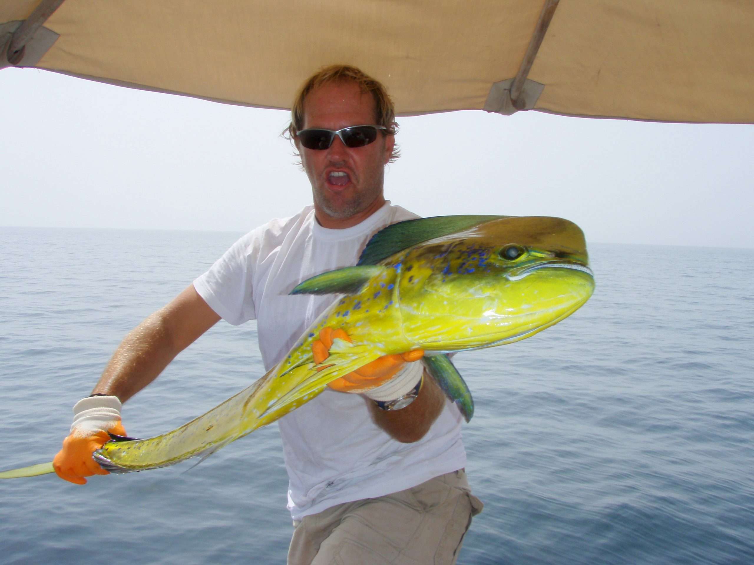 Fortunately, we are starting to get the hang of fishing which is great as fish are abundant in the Red Sea. We catch tuna and make delicious sushi and tuna salads. We hook a giant barracuda but decide to throw it back. For starters, we don’t like the taste very much but they are often poisonous due to thier diet of coral fish, which can make you quite sick. We catch a 1.5-meter long dorado and…. yes, we throw that back too. Have you ever seen a dorado? It is really a very, very beautiful fish! Bright blue with yellow and green.